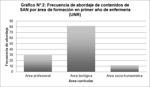 El Gráfico Nº1 muestra que los contenidos relacionados con SAN aparecen de manera más frecuente en las asignaturas relacionadas con la biología, tales como Nutrición y Dietoterapia, donde se abordan cuestiones como la nutrición básica y las enfermedades asociadas con deficiencias o excesos alimentarios. Sin embargo, estas asignaturas tienden a enfocarse en la dimensión biológica de la SAN, que si bien es importante, no abarca los aspectos más amplios y complejos del problema, como el acceso desigual a los alimentos o las barreras socioeconómicas que impiden una alimentación saludable en comunidades vulnerables (Díaz Bonilla, 2023).